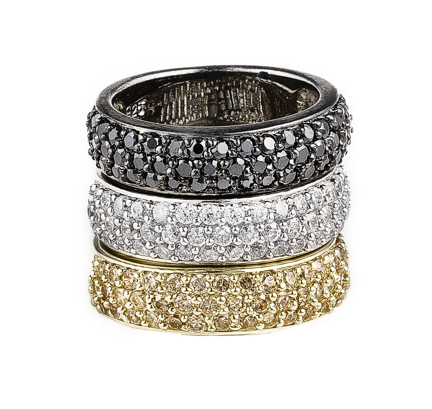 The rings feature a lustrous pavé setting with either clear, black or champagne cubic zirconia stones. Wear all three rings together or mix-and-match your favourite combination for different looks.