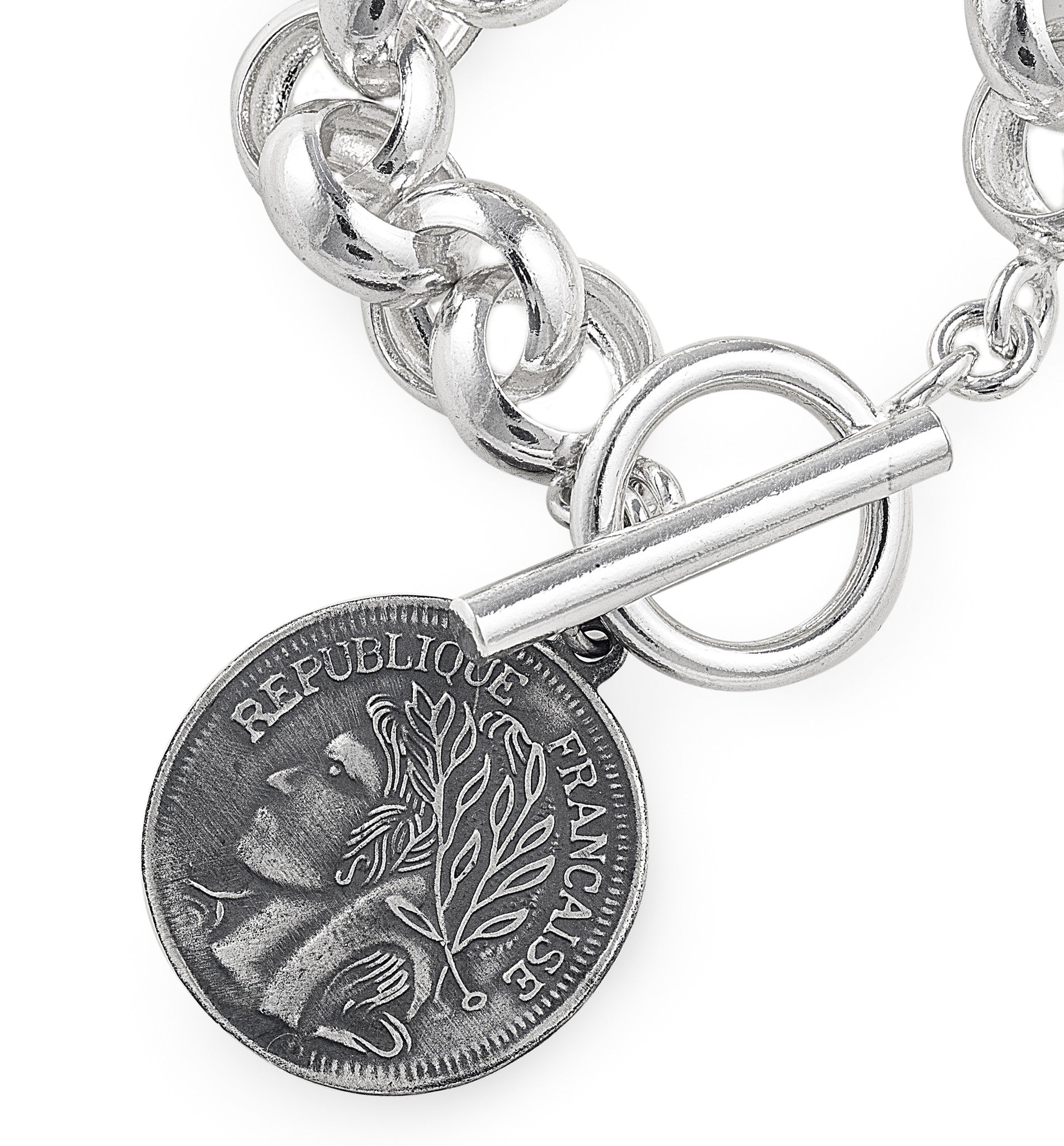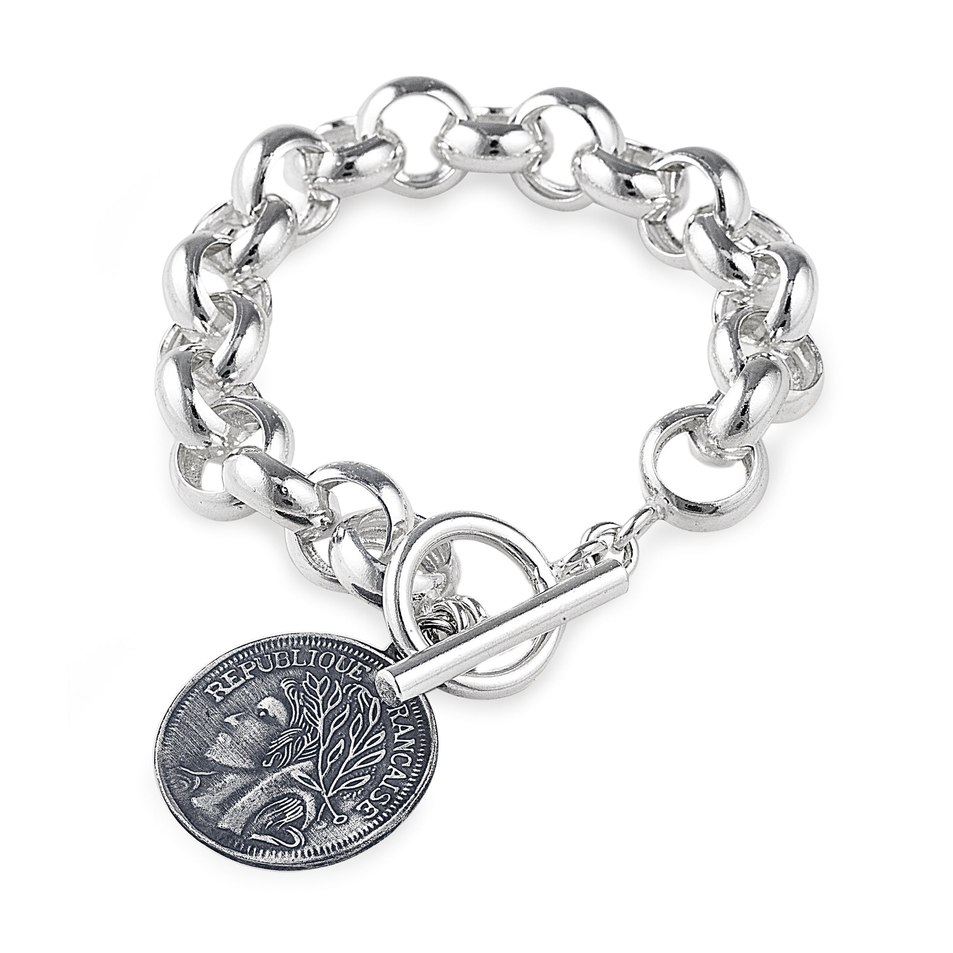 This eye-catching bracelet is made up of 20 chain links and accentuated by a magnificent large coin charm. Result: Wow Factor