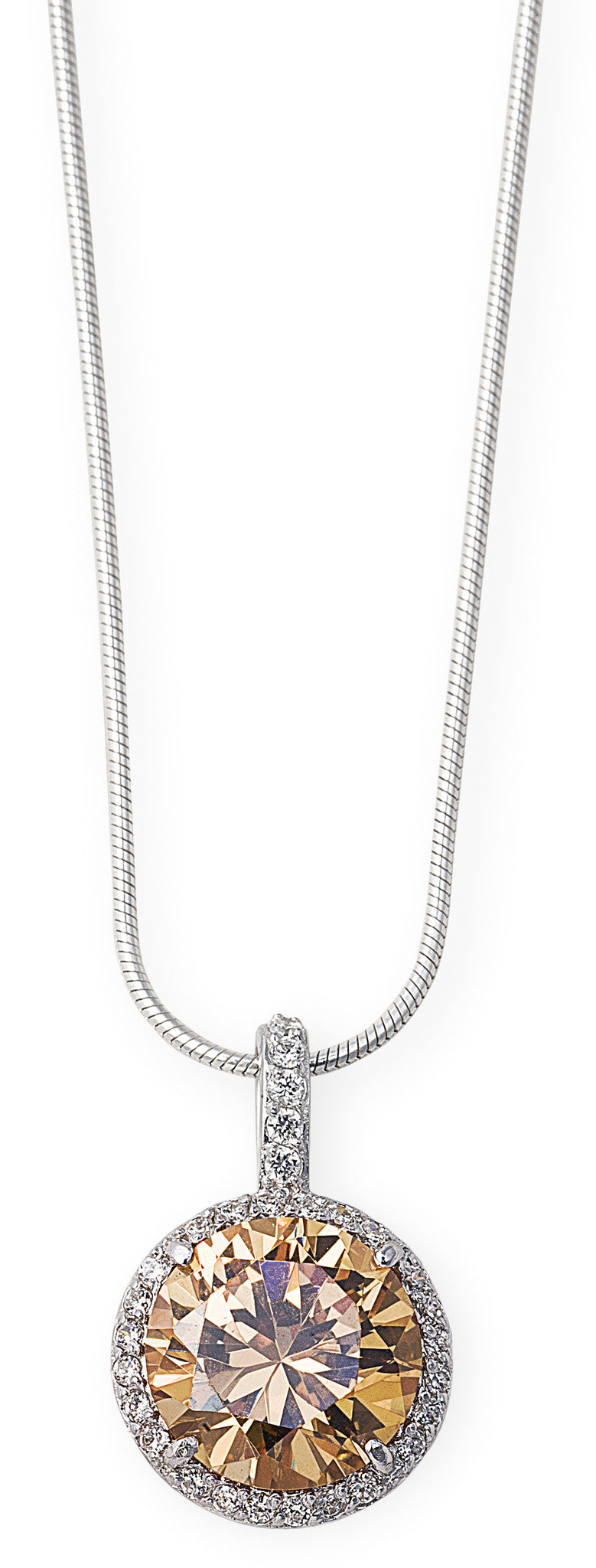 The Empire Necklace is a hanging antique style 925 sterling silver necklace featuring a large regal champagne cubic zirconia stone. Matches our Empire Earrings. Result: Instant Elegance