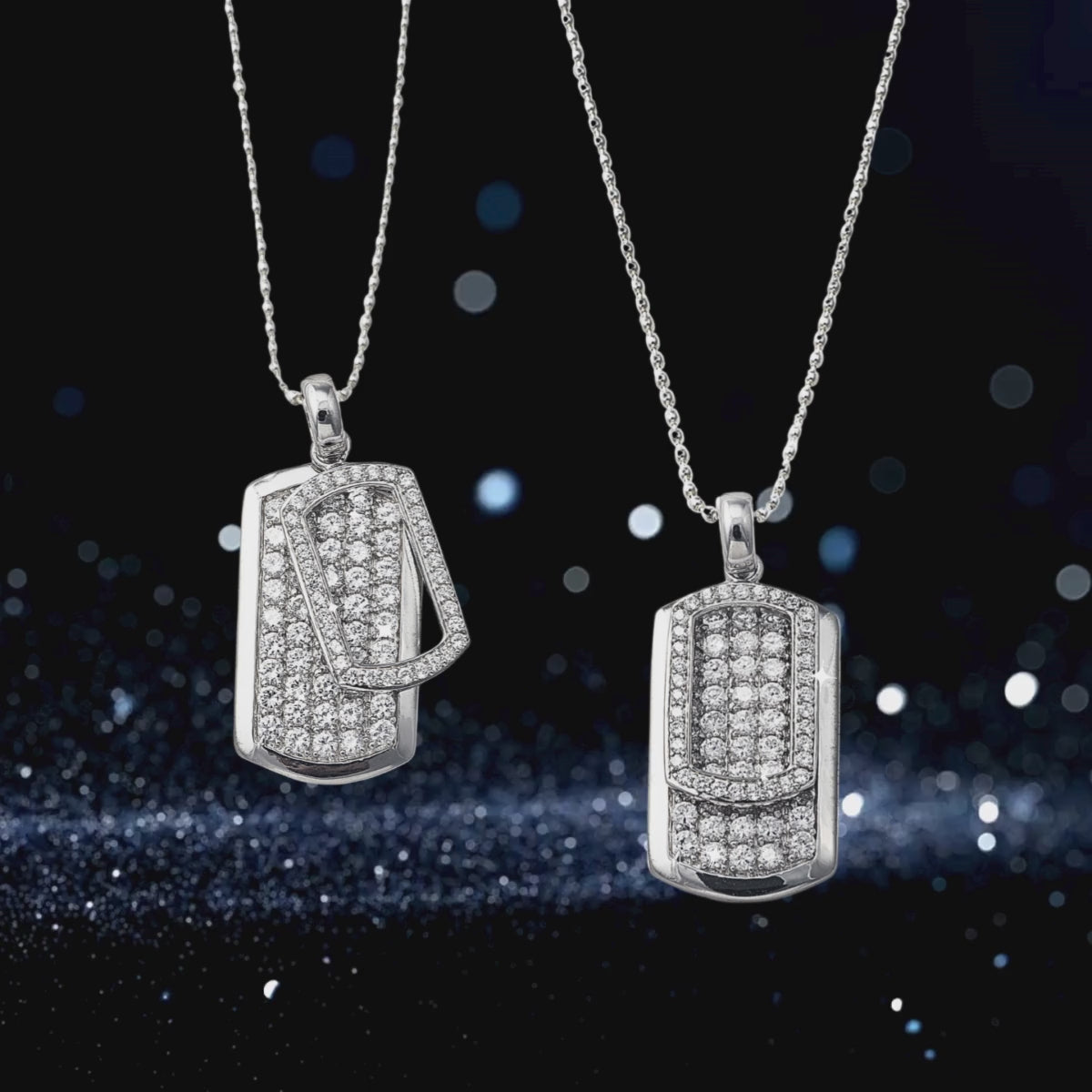 The High Bling Tag Necklace is a super sparkly tag-style pendant featuring numerous cubic zirconia stones with a second overlaying 'cut-out tag' with even more sparkling cubic zirconia stones to create maximum bling. Result: High Impact