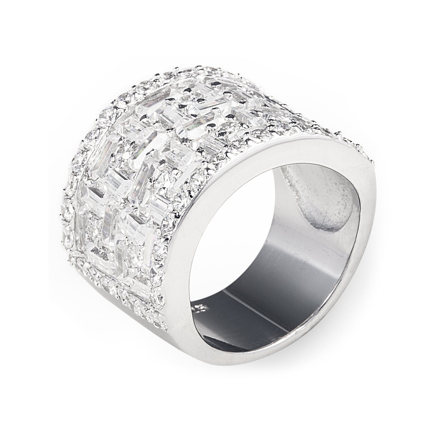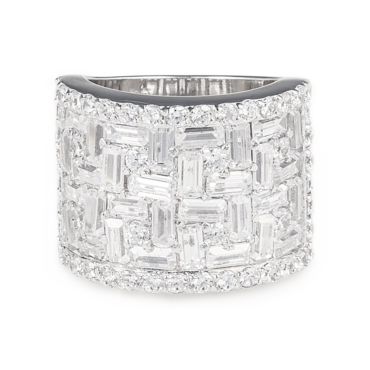 The Santuri Ring is an artistically designed 925 sterling silver ring with a captivating geometric setting made with baguette-cut cubic zirconia stones. Matches our Santuri Earrings. Result: Instant Elegance